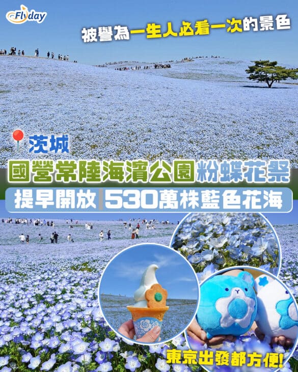 波波草|粉蝶花|日本東京賞花|被譽為「一生人必看一次」的絕景——茨城縣國營常陸海濱公園的「粉蝶花海」,今年提早報到!園方宣布春季花卉接力活動「Flowering 2026」已於3月20日正式展開。重頭戲530萬株粉蝶花(Nemophila)預計將於4月中旬迎來最靚的滿開狀態!除了震撼的粉藍色山丘,同場還有鬱金香及玫瑰輪流綻放,更有超IGable的限定藍色甜品!即睇開花時間表及交通攻略! 國營常陸海濱公園的波波草及粉蝶花丘,每年都吸引不少遊客專程前往欣賞。