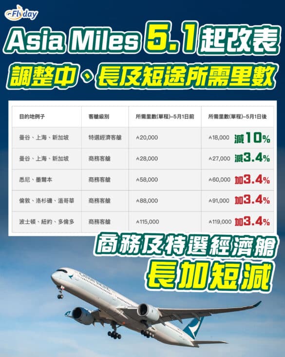 國泰 Asia Miles|亞洲萬里通|Asia Miles Award Chart|國泰 Asia Miles (亞洲萬里通) 於5月1日起再次調整飛行獎勵兌換表,是繼25年4月調整後再次變動。中、長及超長途商務加約3.4%、而短途商務及特選經濟艙就減約3-10%,長加短減!如果之後想換飛,就記得睇啱日子換!小編亦更新了最新飛行獎勵換算表俾大家參考,之後國泰會唔會再推出里賞航班氹下大家呢?