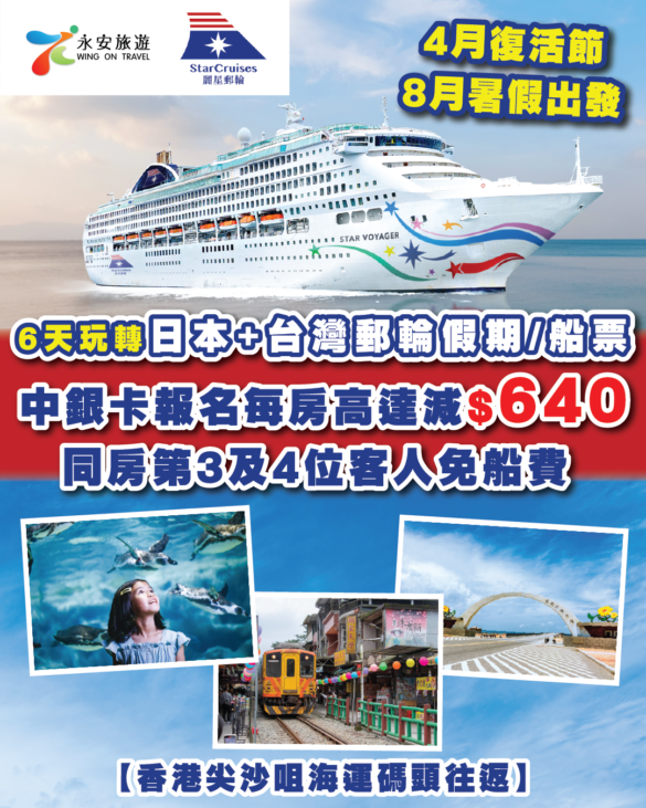 想趁復活節或暑假帶全家去一趟輕鬆旅行?坐郵輪絕對係最chill嘅選擇!永安旅遊推出限時優惠,即日起至3月31日期間,報名《領航星號》日本及台灣的6天郵輪假期/船票,每位低至$2,900起(4人1房平均價);如果想有專業領隊隨團為你打點好行程,可以訂購優遊緻選嘅郵輪假期^,稅項全包及免收旅行團服務費,每位低至$5,400起(4人1房平均價)。若持有中銀信用卡,報名郵輪假期更可享額外每單最高享$640折扣,每位低至$5,240起(4人1房平均價)。立即報名,上船一次過玩轉日台兩地喇!